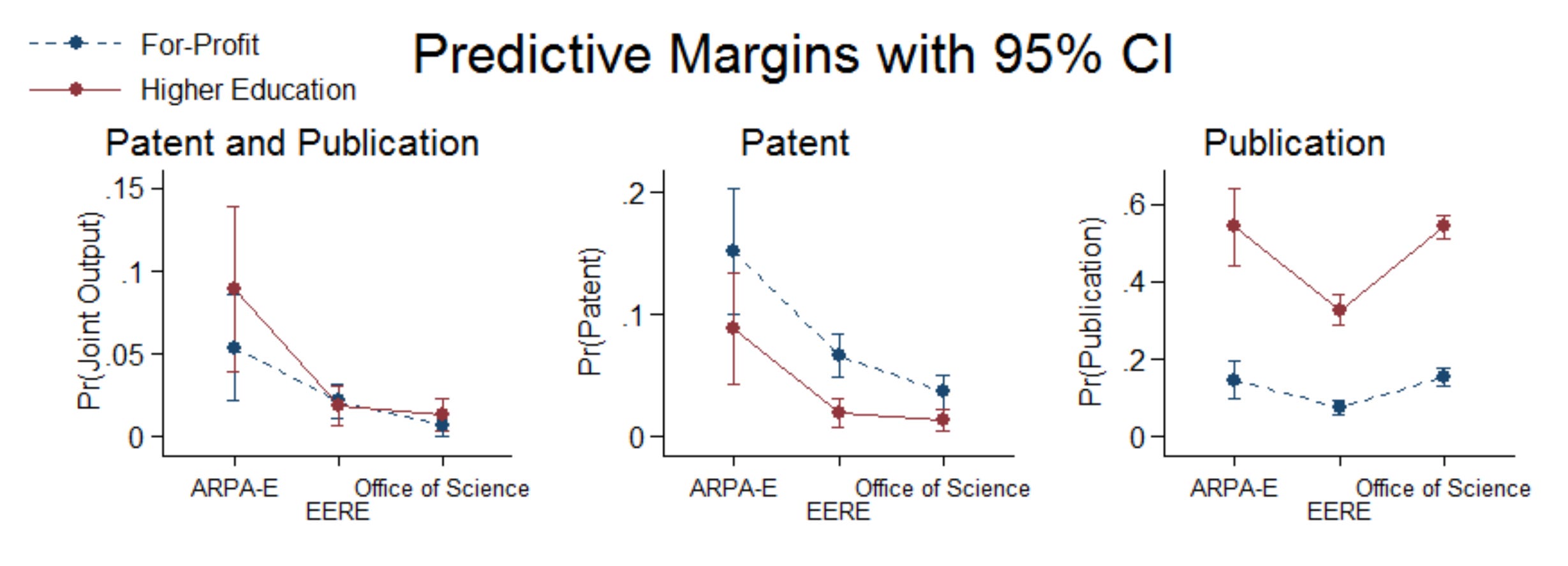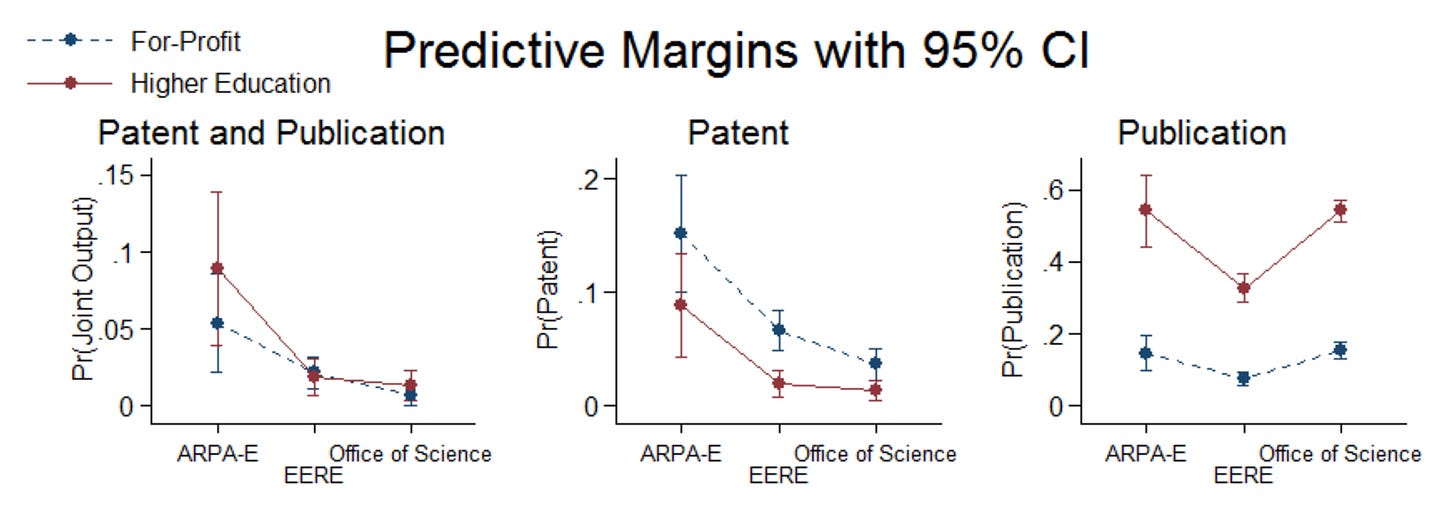A back-of-the-envelope synthesis of the paper’s results across comparison office, performer type, and outcome suggests that ARPA-E generated roughly 3x as much observable paper-and-patent output per dollar as traditional DOE grantmaking.5 Importantly, this includes a selection effect: at the time, ARPA-E’s budget was significantly smaller than either comparator agency, and as a result it could be more selective. Depending on how you frame the counterfactual, this could be a feature or a bug of the comparison, but in any case, a conservative adjustment comparing only within the same budget window of top-performing grants still finds a 1.3x output advantage for ARPA-E.6 With the necessary caveats about papers and patents, these findings are noteworthy in that they suggest that the model itself (even controlling for performer type and selection) is meaningful.